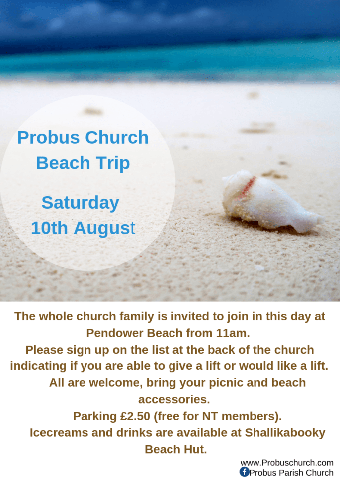 Probus Church is off to the beach, this coming Saturday (10th) we will be meeting up on Pendower Beach from 11am onwards. Bring your picnic lunch and beach paraphernalia ready to enjoy a time of relaxing and socialising. Don't forget your money for ice-creams or drinks from the Beach Hut. If you need a lift … Continue reading Probus Church Beach Trip